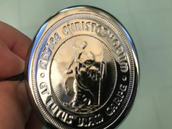 Verchromte Klingel mit der Einprägung des heiligen St. Christophorus. Ø Aussen: 55 mm Höhe: 30 mm Made in Germany. Die Klingel Neu gem. Bilder