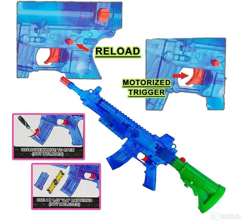 Mit wenigen Handgriffen lässt er sich abnehmen, am Wasserhahn füllen und wieder einsetzen. Konzentrieren Sie sich auf Ihre Deckung und das Zielen. Alles andere übernimmt die innovative Wasserwaffe.Seine Reichweite beträgt bis zu sieben Metern. Damit liegen Sie bei der nächsten Wasserschlacht ganz klar vorne. Das Automatik Wassergewehr ist mit neuester LED Technik und Soundeffekten ausgestattet.