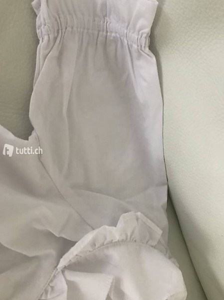 Ausschnitt und Aermel mit Rüschen, Rücken geschnürt.