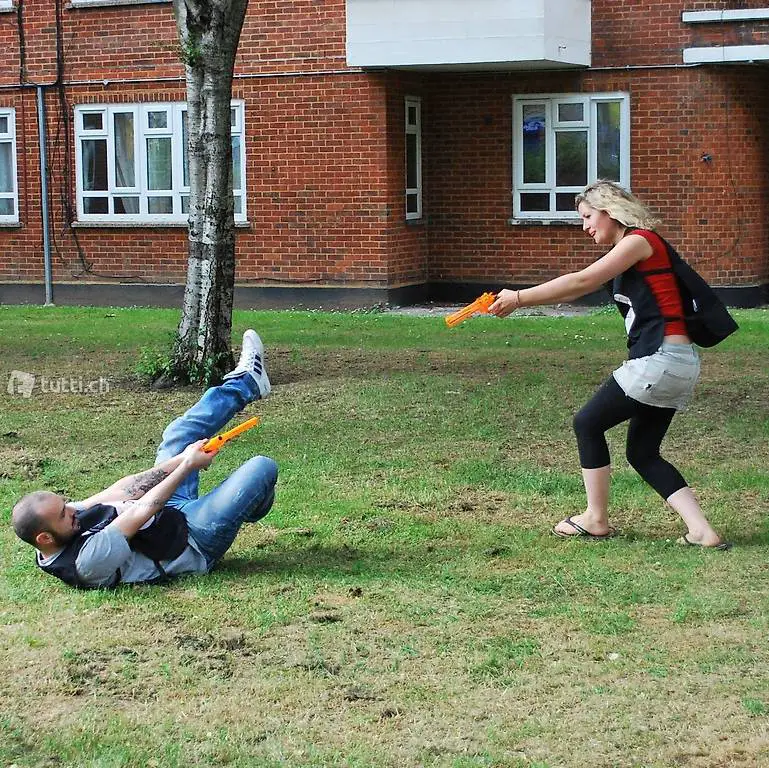 Im Lieferumfang befinden Sie 2 Wasserpistolen (Farbe kann je nach Lagerbestand abweichen) und 2 Westen. Die Ware ist Fabrikneu und kann direkt vor Ort abgeholt werden.