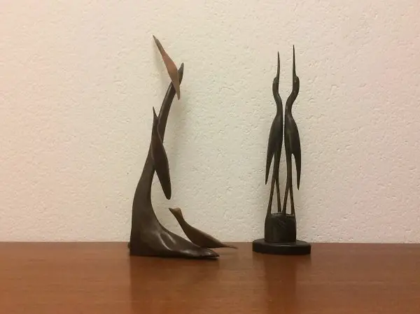 retro Holz Vögel sind stilisiert, was dazu führt, dass sie auch zu modernen Einrichtungen passen. Die zwei Deko Kraniche aus Horn (vermutlich Kuhhorn) sind etwas näher an der Realität. Zeitlose Deko fürs