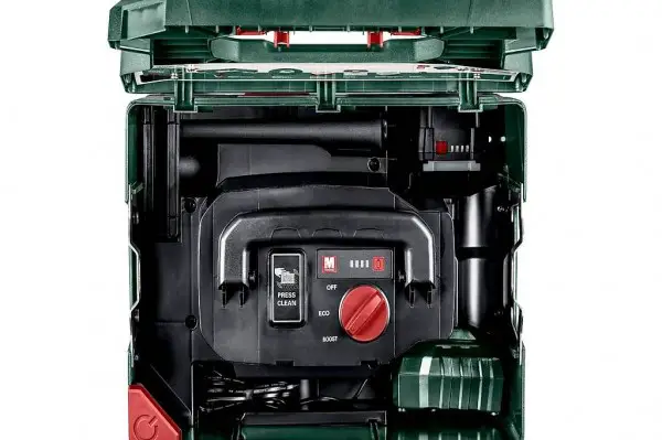 - PressClean: manuelle Filterabreinigung durch starken Luftstrom bei Schalterbetätigung am Sauger in den Arbeitspausen