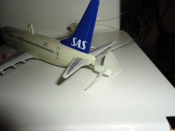 Das Flugzeug muss an eine Zimmerdecke gehängt (geschraubt) werden, damit es sich frei im Kreis drehen kann (Propeller hinten, batteriebetrieben). Dafür werden 3 Schrauben mitgeliefert!