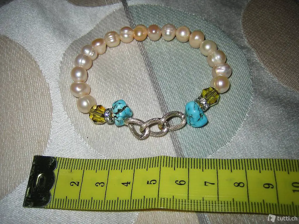 Armband Süsswasserperlen hell Glas grün Türkis silber Glitzer Metall gold. Elastisch.