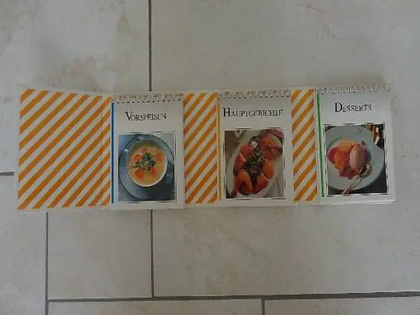 Kochbuch ganz neuer Art liegen immer 3 Gänge eines Menüs aufgeschlagen vor Ihnen: leckere Vorspeisen, schmackhafte Hauptgerichte & köstliche Desserts.
