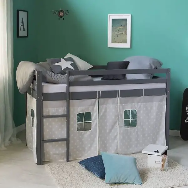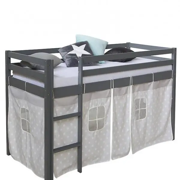 Dieses stabile, graue Spielbett mit Sternchen-Stoffbezügen ist ein Traum für jedes Kinderzimmer. Der