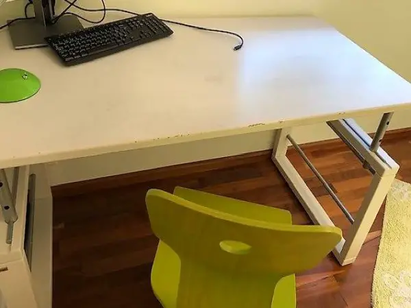 - Tischplatte weisst Gebrauchsspuren auf. Kann ggf. auf Wunsch eigenständing ausgebessert werden, da Massivholz