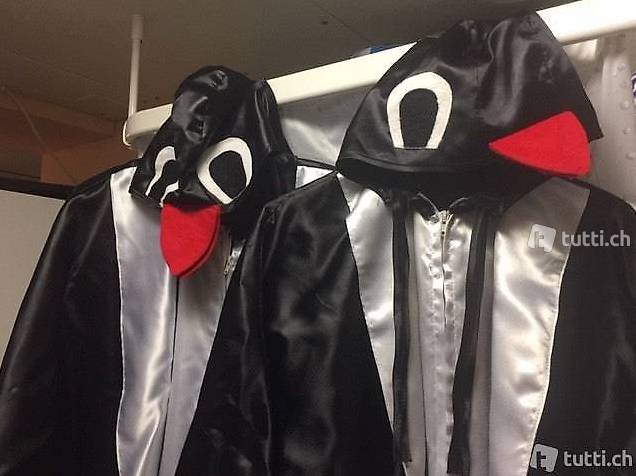 Anzug. Beide sind handgenäht aus hochwertigem Satin, weit genug, um sich darunter warm anzuziehen. Die angenähte Kapuze mit aufgenähten Augen und rotem Schnabel geben dem Outfit das gewisse Etwas. Praktisches An- und Ausziehen durch