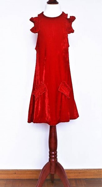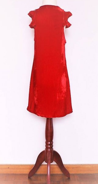 Rock aus fast schon königlichem, rotem Panne-Samt mit verspielten Rüschen an den Schultern und auf dem Rock-Vorderteil.