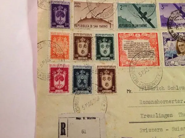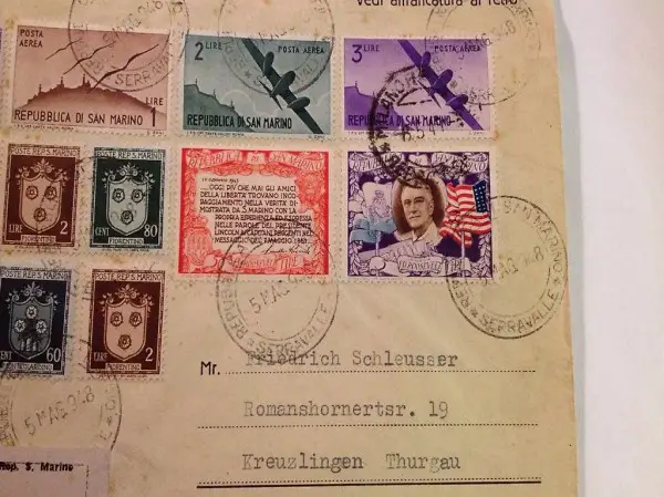 Bella busta viaggiata nel maggio del 1948 raccomandata, da S.Marino a Kreuzlingen, con affrancatura mista, timbri eccellenti anche sul