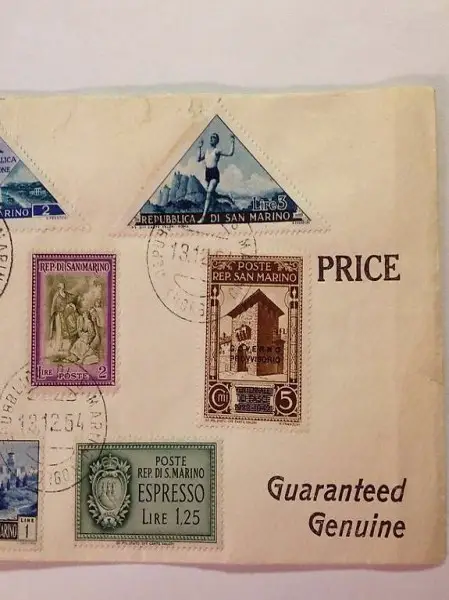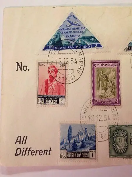 Bella busta filatelica con 7 francobolli Rep. San Marino, timbratura eccellente 13.12.1954. Fr. 25.-