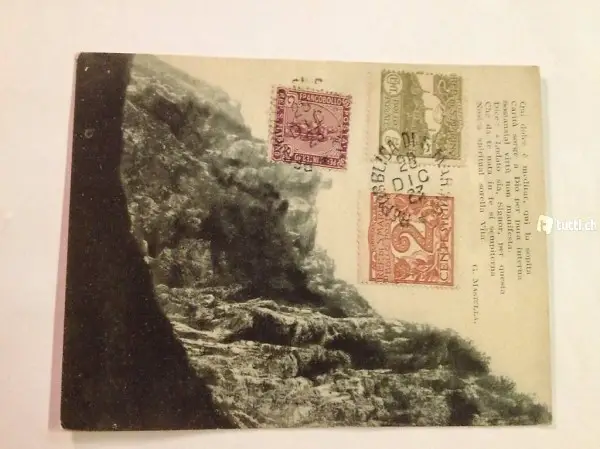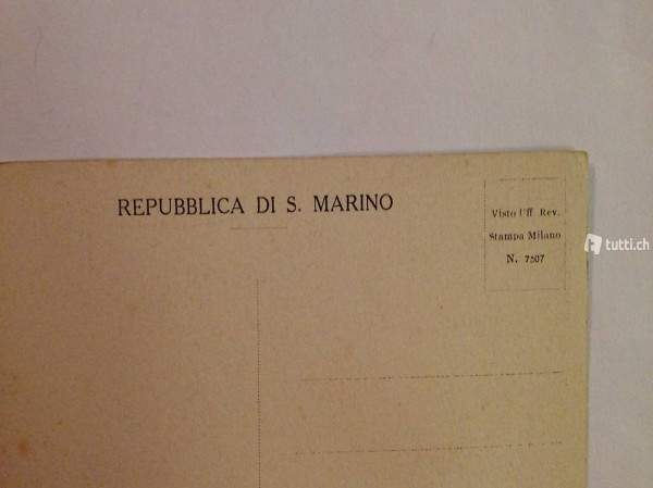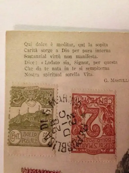 3 valori su cartolina d'epoca di San Marino, con poema di G.Mastella. Con bella timbratura del 28 dic. 1923.