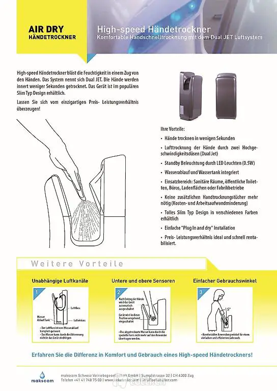 Händetrockner, bläst die Feuchtigkeit in einem Zug und innert 15 Sekunden von den Händen.
