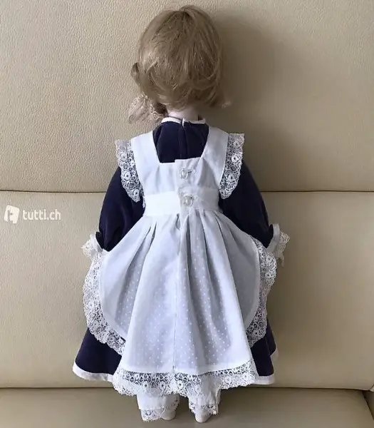 ... Gesicht handbemalt, mit Gretchenfrisur (unverändert), Samtkleid blau und eingefasst, Überschürze hinten und vorne (geknöpft) mit Spitzen verziert, ebenso die lange