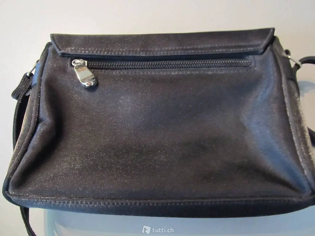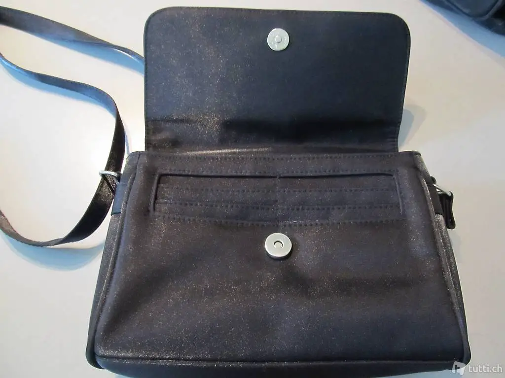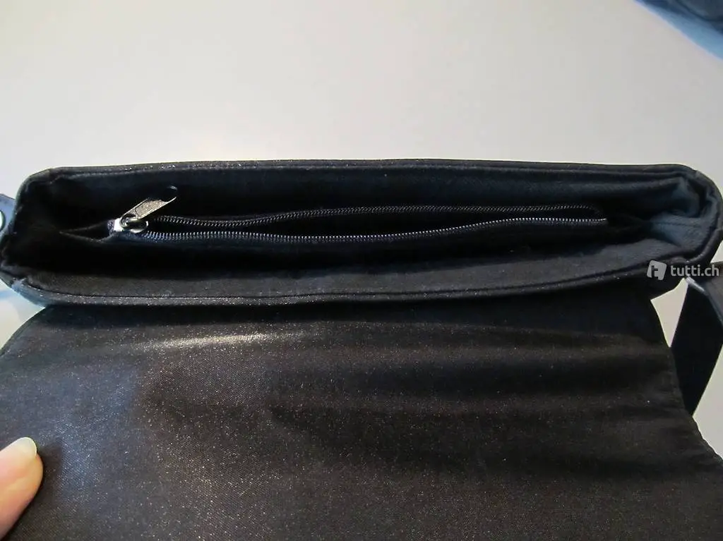 Umhängetasche schwarz, Riemen verstellbar, innen 2 grösserer Fächer und 1 schmales Fach mit Reissverschluss, aussen befindet sich auch noch ein Fach mit Reissverschluss.