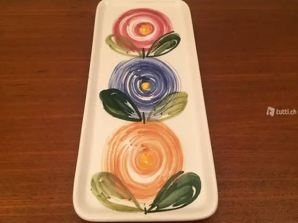 Dekoration mit 3 Blumen ist von Hand bemalt. Die sixties oder seventies Dekoschale ist in sehr gutem Zustand mit minimen Gebrauchsspuren. Das Kuchentablar ist auf der Rückseite mit 3144 2 und einem Stempel gemarkt (vermutlich Krösselbach). Das mid century Kuchentablett eignet sich auch als