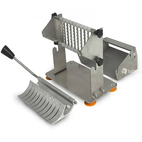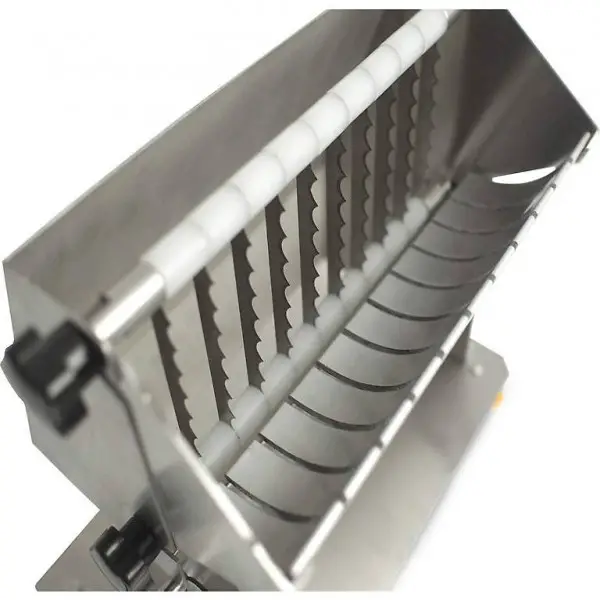 Der Currywurstschneider verfügt über 10 extrem scharfe Klingen, die für ein sauberes Schneiden von Würsten bei geringem Kraftaufwand sorgen. Der Vorteil bei manuellen Geräten liegt gegenüber den elektrischen Wurstschneidern in der wartungsfreien Nutzung und den geringen Verschleissteilen. Die vier angebrachten Saugnäpfe sorgen für einen sicheren Stand des Gerätes.