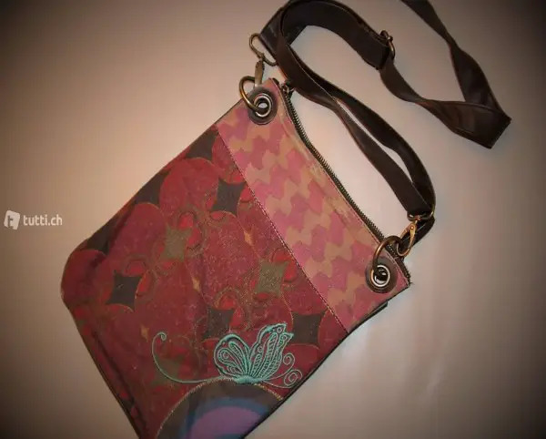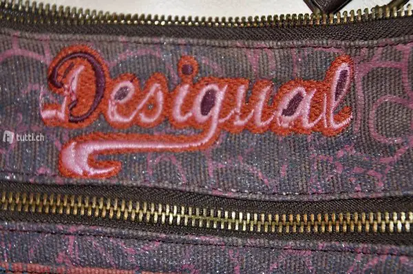 Original Desigual Henkeltasche, altrosa, mit buntem Muster. Henkel braun (längenverstellbar).