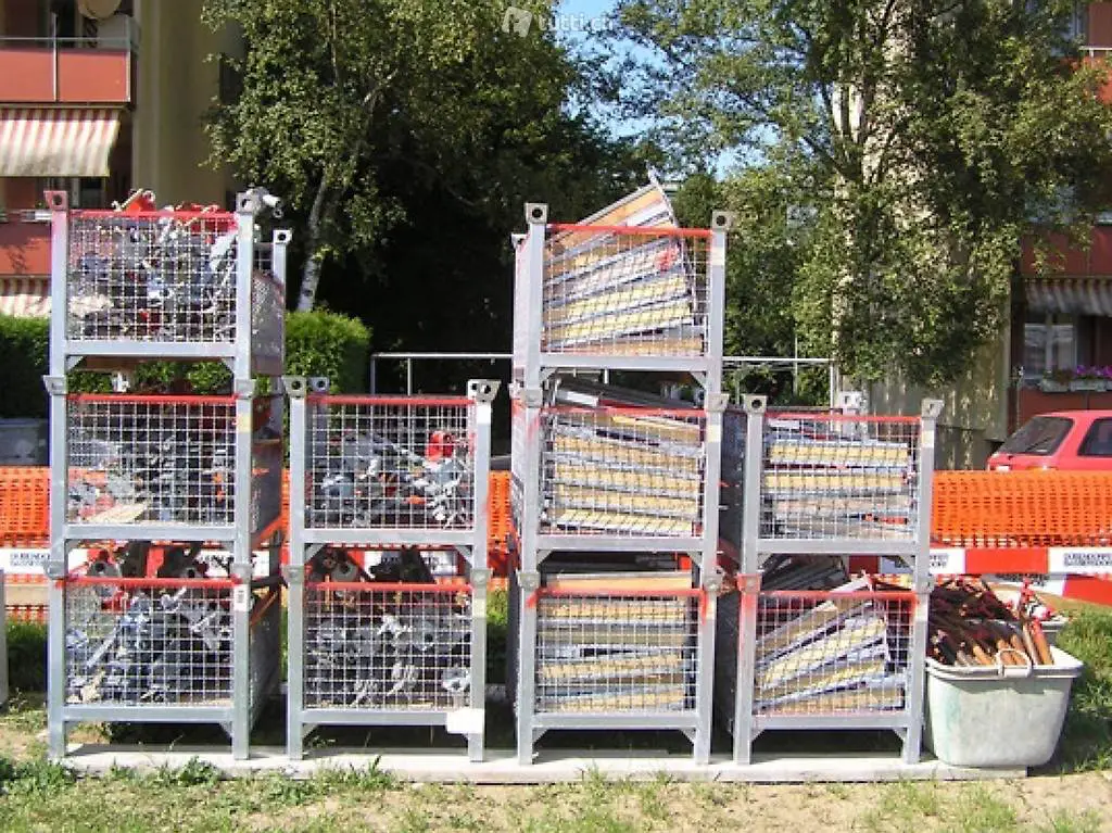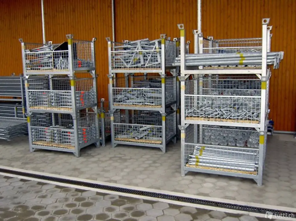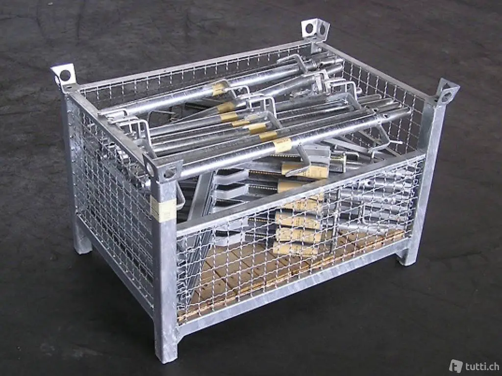Praktische, feuerverzinkte Gitterbox mit integrierten Kranösen. Aussenmasse: 1,26x0,86 m