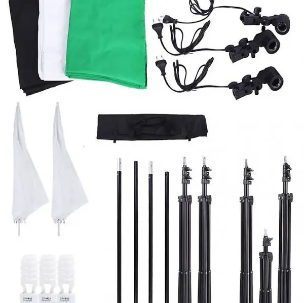 NEUE WARE (Mit Originalverpackung)-Photography/Video Studio Triple Lighting Kit with 10ft * 12ft Black White Green Muslins Backdrops Background Support System with Case
