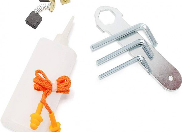 Steckschlüssel, eine Kohlebürste und eine Flasche mit Öl.