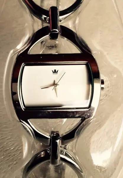 Quarz Uhr und läuft mit einer Batterie. Die Uhr ist spritzwasserdicht.