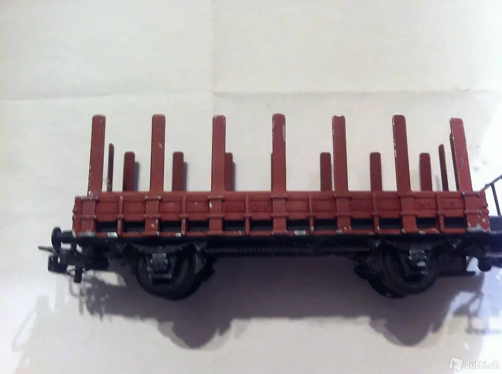 Schöner und gepflegter HAG Rungenwagen, braun, Guss und Metall und ohne Kunststoffteile. Bespielt aber ohne Fehlteile und alle Funktionen i. O. Einzig an den Rungen ist ein Farbabplatzer