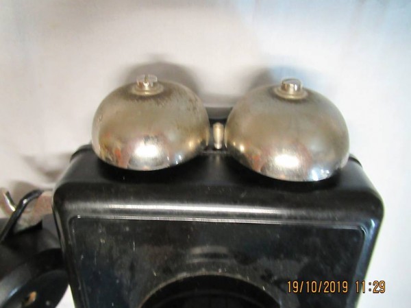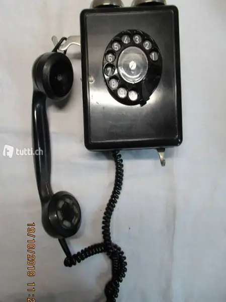 Haustelefon, Wandtelefon, alt herkömmlich, schwarz, mit Drehscheibe, Wahlscheibe, oben 2 Klingeln wegen Hausabriss, zu verkaufen, Grösse 21/14/8, Hörer zum Senkrecht aufhängen, und unten eine Warte Hänge , bereits demontiert
