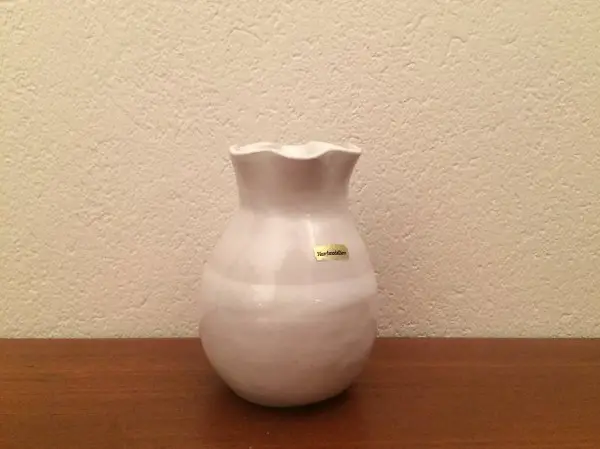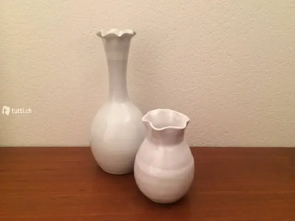 retro Vasen aus Handarbeit sind vom Stil her sehr ähnlich, unterscheiden sich aber etwas in ihrer Form. Beide Blumenvasen sind mit einer weissen Glasur versehen und verfügen über einen gewellten Rand. Die kleinere 50-er 60-er Ziervase ist am Boden mit einem Fischchen (nicht Linück) und einer 7 gemarkt und zusätzlich mit einem ,handmodelliert? Kleber versehen. Sie könnte von Maya von Rotz-Kammer stammen. Die beiden mid century Vasen aus Keramik sind in sehr gutem Zustand.