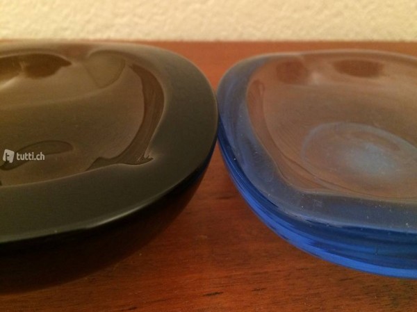 Glas. Beide Glasaschenbecher sind am Boden geschliffen - ein Zeichen guter Qualität. Beide mid century Zigarettenaschenbecher sind in gutem Zustand mit kleineren Kratzern, Beschädigungen sind keine vorhanden.