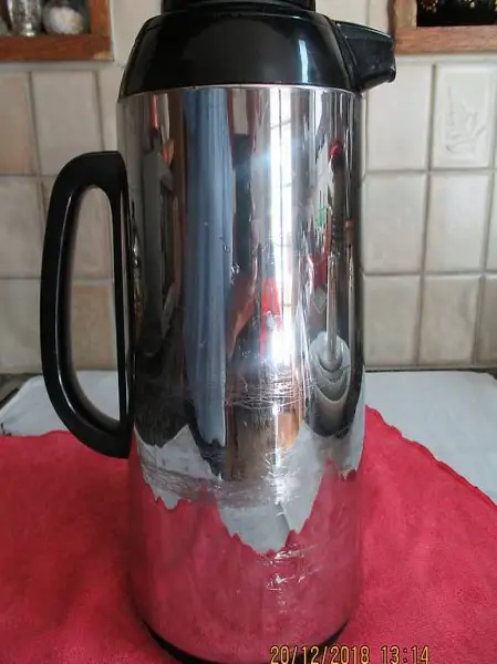 eine Seite des Kruges weist einige Kratzer im Chromstahl auf