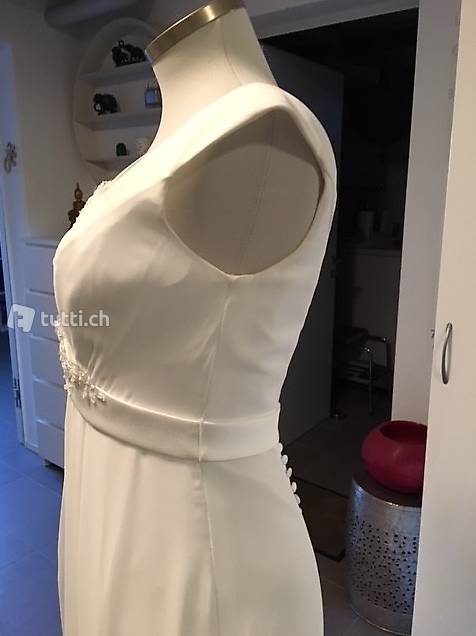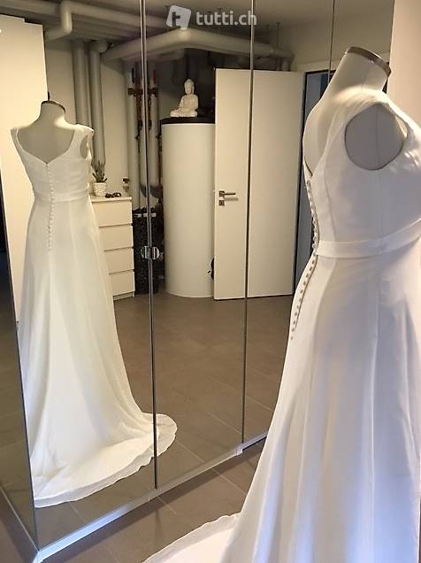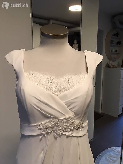 Noch nie getragenes Brautkleid (NEU) mit Träger. Figurumschmeichelndes und fliessendes Material. Grösse 38/40 für eine Körpergrösse von 1.68 mit Schuhhöhe ca. 5 cm. NP CHF 1'280, gekauft bei Brautmode Wicki in Beromünster.