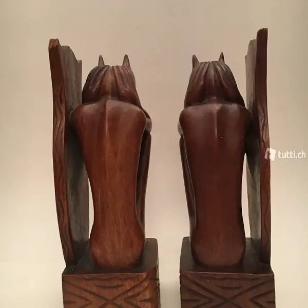 Handgefertigte Buchstützen aus Holz mit zwei Wasserspeiern, monströsen Kreaturen zum Schutz der gotischen Kathedralen, zweite Hälfte des 19. Jahrhunderts.