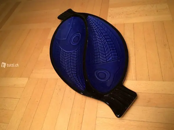 Schöne Schale aus Keramik im typischen Design der Fünfziger und Sechziger Jahre. Die Keramikschale ist in Form von zwei aneinanderliegenden Fischen gestaltet, was eine ovale Form ergibt. Die fifties oder sixties Dekoschale ist in sehr gutem Zustand. Die mid century Anbietschale stammt vermutlich aus Deutschland - sie ist am Boden gemarkt mit 891.