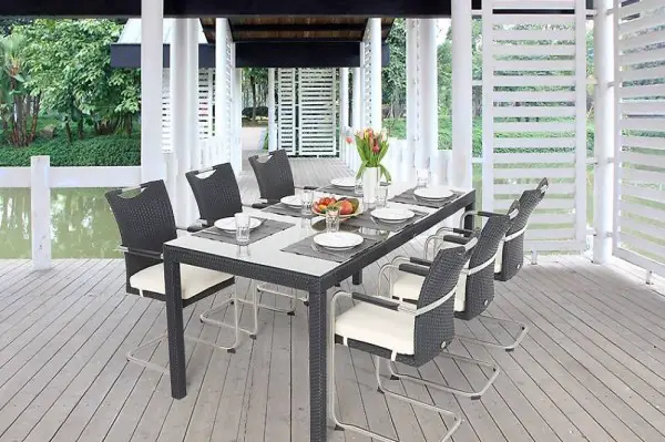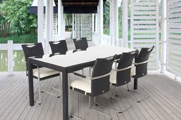 Das hochwertige Polyratten der Essgruppe ist wetterbeständig. Der leichte Rahmen dieses Rattan Esstisches ist aus pulverbeschichtetem Aluminium hergestellt. Die Sitzpolsterbezüge sind abnehm- und waschbar. Die Stühle sind stapelbar.