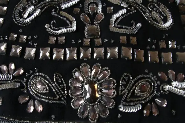 Es glitzert und funkelt rund ums Kleid. Pailletten und Steine wurden in das ganze schwarze Kleid eingearbeitet (Vorder- und Rückseite). Wunderschöne Muster. Rückseite mit Reissverschluss. Das Kleid ist gefüttert. Gr. 36. L 95 cm.