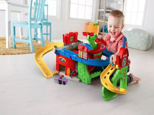 Bei der Little People Hochhausrennbahn steuert das Kind den Fahrspass selbst. Es kann die Wheelies-Fahrzeuge auf der horizontal ausgerichteten Bahn die Strassen entlang- und die Rampen hinunterflitzen lassen. Zum Auftanken wird unten an der Zapfsäule ein kurzer Stopp eingelegt. Ist die Rennbahn vertikal ausgerichtet, geht es erstmal über 90 cm nach oben. Dort kann das Kind seine Wheelies-Fahrzeuge aufstellen und über die Spiralrampen bis ganz nach unten sausen lassen. Mit Hilfe der Eltern lässt sich die Hochhausrennbahn beliebig in der gewünschten Ausrichtung aufbauen. So kann sich das Kind immer wieder neue Abenteuer ausdenken, egal ob es im Sitzen oder im Stehen spielen möchte.