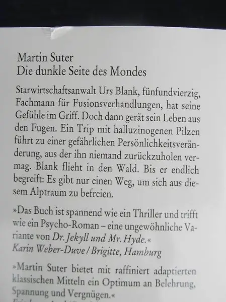 Wirtschaftsanwalt Urs Blank, fünfundvierzig, hat seine Gefühle im Griff. Er hat es gelernt, sich keine Blösse zu geben, hingegen die der anderen zu nutzen. Blank ist Fachmann für Fusionsverhandlungen und der Star der Branche. In letzter Zeit allerdings quält ihn ein diffuses Unbehagen ? auch ein Grund, warum er sich so intensiv um die schöne Lucille bemüht, die ein völlig anderes Leben führt als er. Durch Lucille lernt er die magische Welt der halluzinogenen Pilze kennen. Bei einem überwältigenden Trip spielt ihm