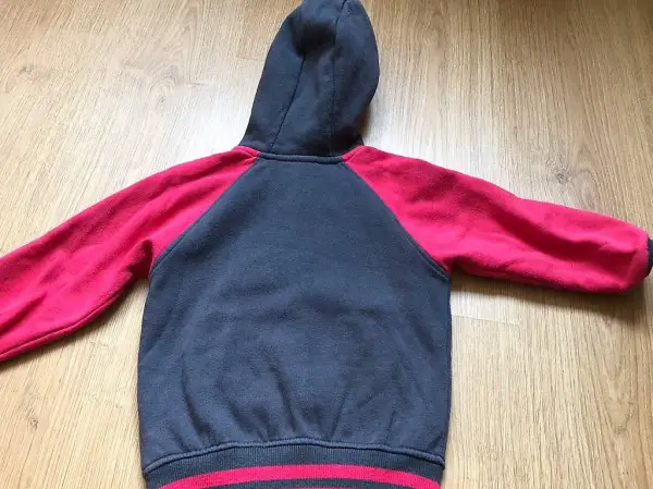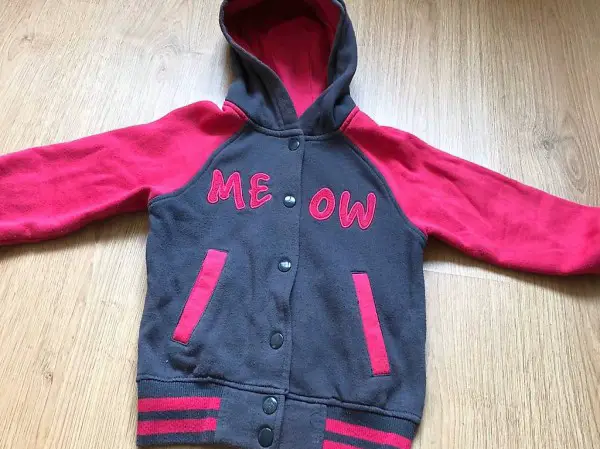 Die pink-graue Jacken hat Grösse 110 / 116. Sie hat eine feste Kapuze und Druckknöpfe.