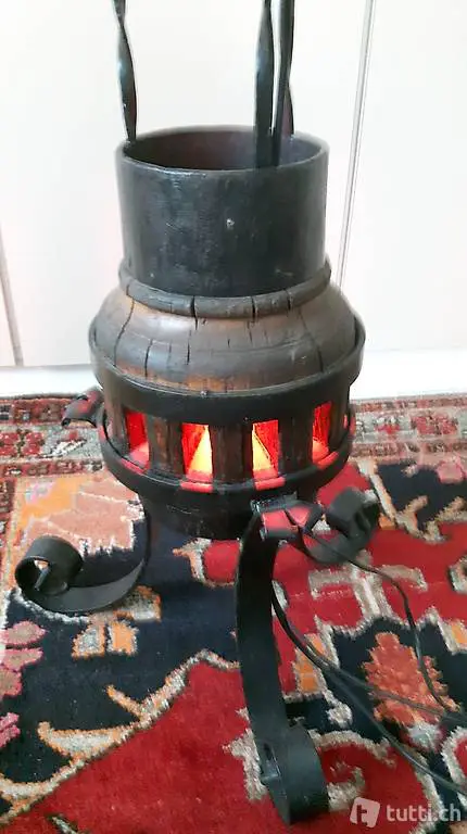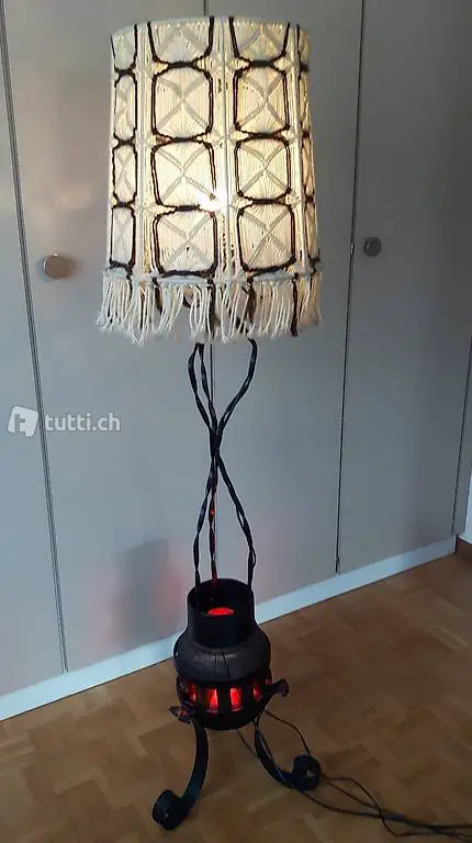 Ständerlampe aus den 70-er Jahren. Restauriert und umgebaut auf LED ?Birnen mit Dimmer. Radnabe mit roter Innenbeleuchtung LED. Diese kann separat ein- und ausgeschaltet werden. Füsse und Aufbau aus Schmiedeeisen. Höhe 160 cm, Ø