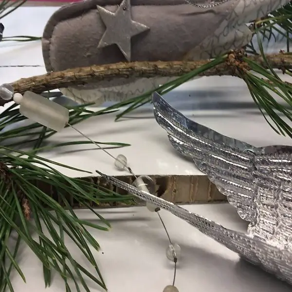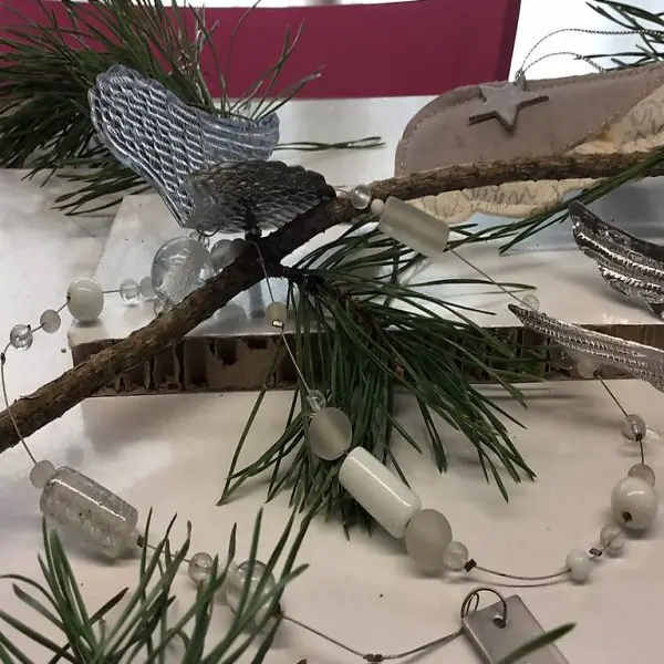 1 x Weihnachtskette mit geprägtem, silbernem Flügelpaar und Glaskugeln in verschiedenen Weisstönen