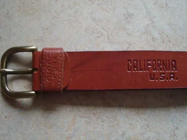 Cooler absolut neuwertiger Gürtel mit goldfarbiger Schnalle. Einprägungen gemäss Fotos. Länge 86 cm, Breite 3,3 cm, Dicke 3mm. Für eher schlanke Leute, Maximum 75 cm.