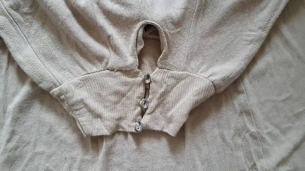 - schwarz, weiss, grau gestreift - 1/2 Fledermausärmel mit V-Ausschnitt (vorne und hinten), 60 cm länge, 80% Acrylic, 20% P.B.T., 30° Waschbar