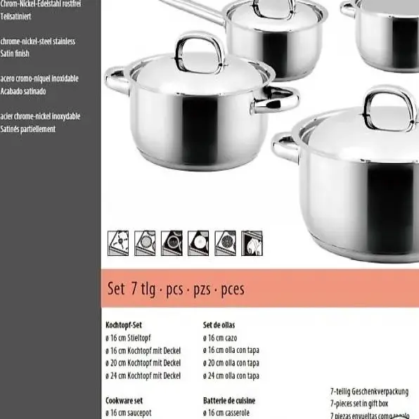 bestehend aus / Lieferumfang: Stieltopf d16cm, Kochtopf mit Deckel d16cm, Kochtopf mit Deckel d20cm, Kochtopf mit Deckel d24cm