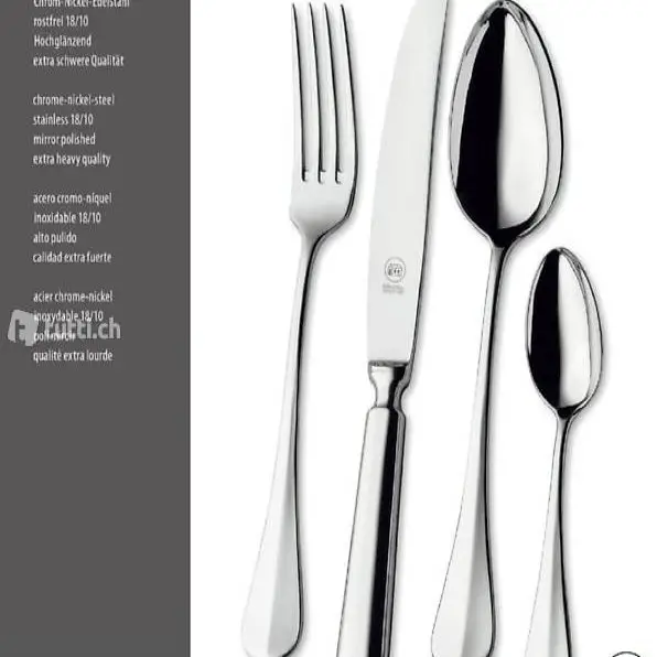 Menülöffel, 12 Kaffelöffel / Teelöffel, 12 Kuchengabeln, 2 Fleischgabeln 15.5cm, 2 Servierlöffel, 1 Suppenvorlegelöffel, 1 Saucenlöffel, 1 Salatbesteck 2teilig, 1 Tortenheber, 1 Sahnelöffel, 1 Zuckerlöffel, 1