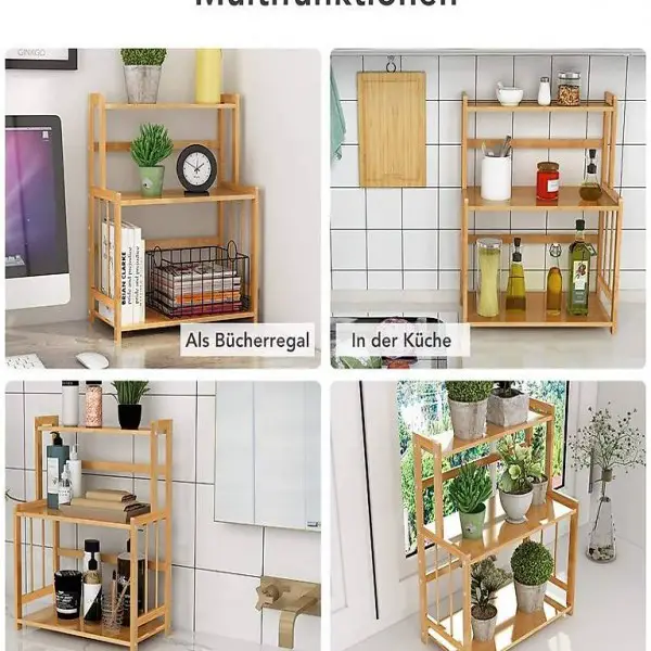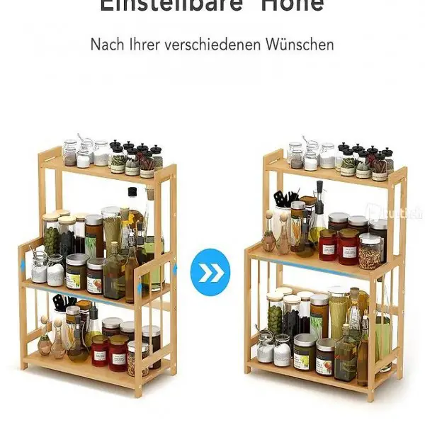 Regal hat insgesammt 3 Etagen. Nach Ihre Wünsche können Sie die Höhe der zweiten Etage einstellen. Sie können Ihre Topfe und Gewürze auf dem Regal legen. Ausser der Küche wird das Regeal auch im Arbeitszimmer, Badezimmer, Wohnzimmer, auf der