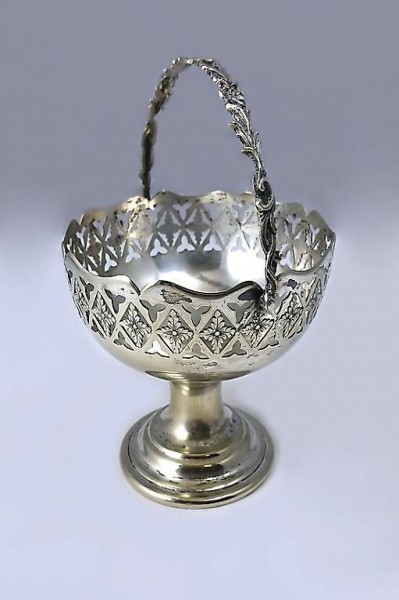 Die kleine zierliche Henkelschale hat zwar schon satte 50 bis 60 Jahre auf dem Buckel, sieht aber trotzdem noch immer sehr hübsch und dekorativ aus. Der Henkel kann bei Nichtgebrauch einfach runtergeklappt werden. Material: Messing versilbert.