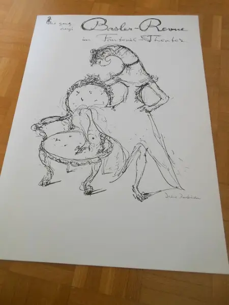 Zu verkaufen BILD/DRUCK von Jrène Zurkinden 1909-1987 die ganz neyi Basler-Revue im Fauteuil-Theater mit Unterschrift, Masse: 45x63,5cm Fr. 80.-
