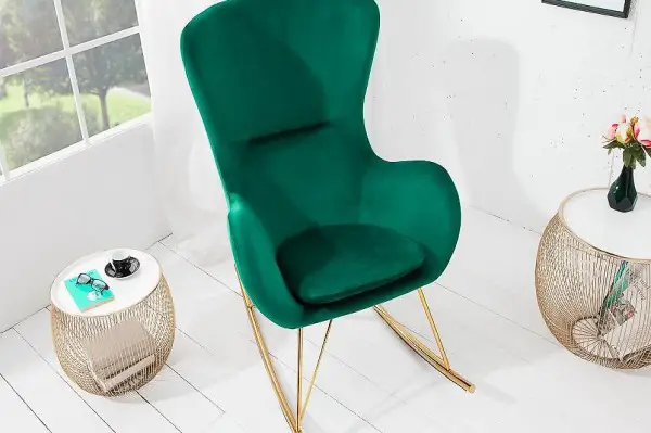 Ein gemütlicher Schaukelstuhl, in Form eines traditionellen Sessels, designt im glamourösen Look ? Sie glauben, das geht nicht? Unser Stuhl SWING vereint genau diese Eigenschaften alle miteinander und begeistert mit seinem gradlinigen und dennoch eleganten Design. Die geschwungenen Kufen aus vergoldetem Metall bilden einen tollen Kontrast zum hochwertigen Samtbezug in einem aufregenden Türkis.