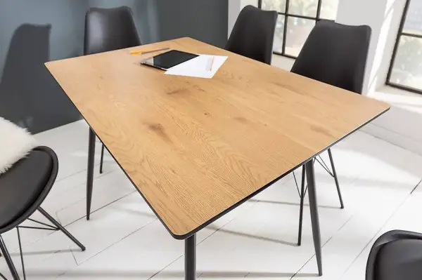 Die grosse Platte aus hochwertigem Holzwerkstoff wurde in einer authentischen Eichen-Optik foliert. So versprüht die Tischplatte ein schönes, natürliches Wohnflair in Deinem Esszimmer. Die schwarzen Metallbeine vereinen gekonnt einen Hauch von Retro Stil mit dem Industrial Design. Dank seines zeitlosen Designs kannst Du den Tisch wunderbar mit ganz unterschiedlichen Stühlen, Lampen und Wohn-Accessoires kombinieren, probiere es einfach aus!